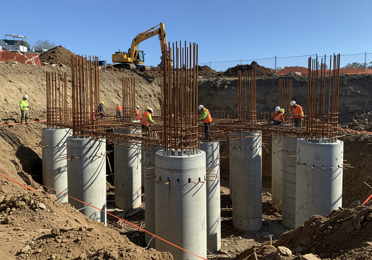 - Piles: Similar to caissons, these are driven or drilled deep into the ground to support the structure.